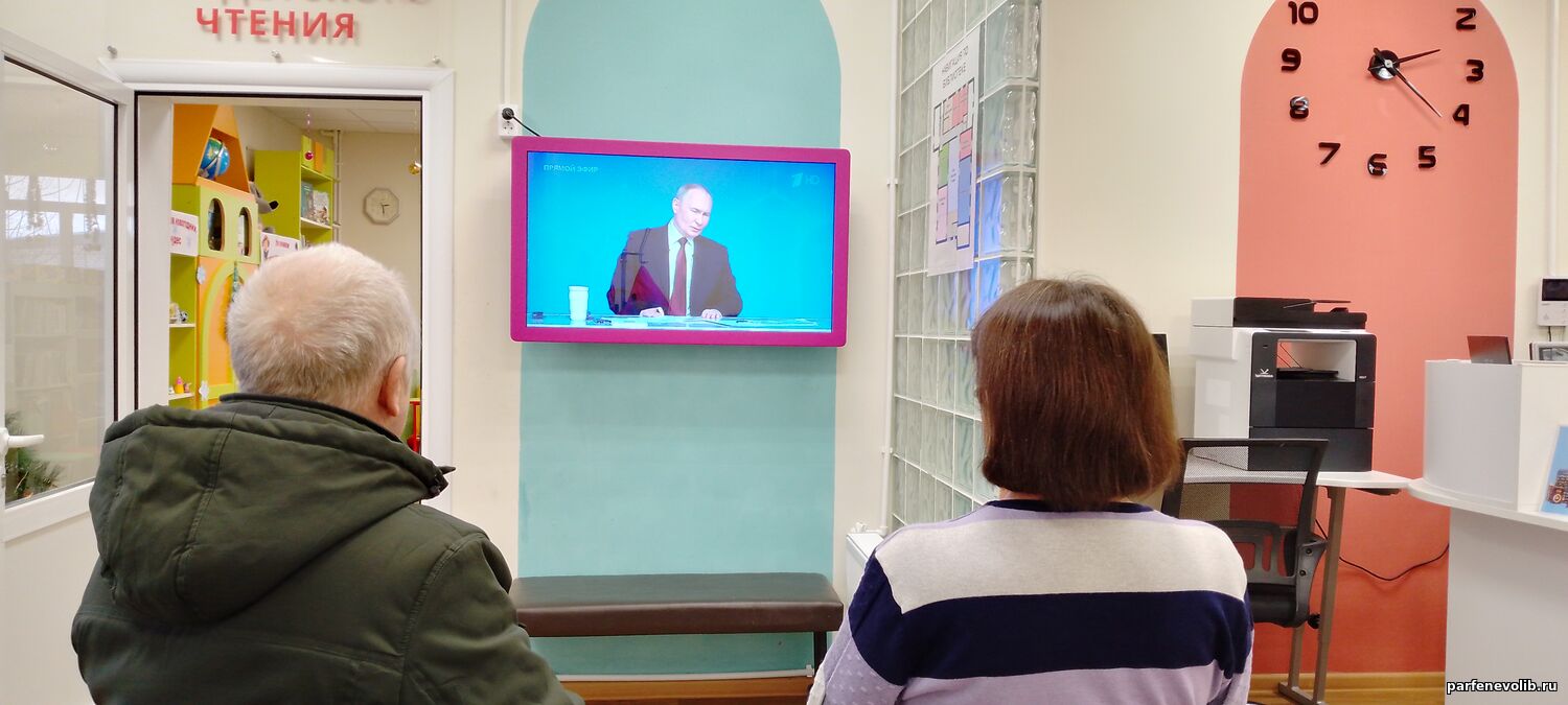 | 19 декабря Парфеньевская центральная библиотека присоединилась к ежегодной прямой линии с Владимиром Путиным. Сотрудники и читатели библиотеки смогли увидеть и услышать ответы президента на вопросы журналистов и граждан, а также имели возможность задать свои. Основные темы касались специальной военной операции, экономики, телефонных мошенников и других актуальных вопросов.