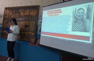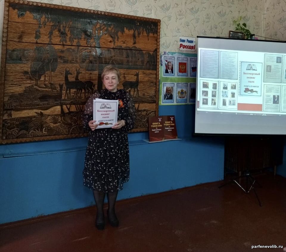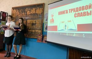 Книга памяти - это народная трудовая эпопея об участниках трудового фронта: о жителях нашего поселка, их родственниках и знакомых. Наш долг –вписать их имена в историю, сохранить благодарную память об их трудовых подвигах и передать эстафету этой памяти следующим поколениям. 119 фамилий, 83 трудовых подвига и судьбы…В основном женских. На слайдах-имена и лица. Ведущие мероприятия Смирновы А.Н. и Арина, листая страницы Книги, рассказали о трудовом вкладе этих людей в Великую Победу. Их рассказ дополнили истории и воспоминания героев Книги, представленные учащимися 9 класса.