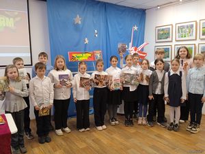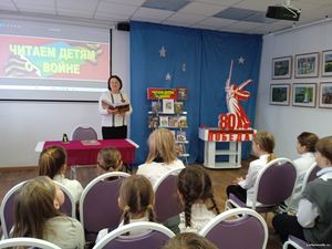 Учащиеся прослушали очень интересный рассказ Б. Рябинина «Маленькая и Большая» про собак медицинской службы, спасавших с поля боя во время войны раненых солдат. Рассказ захватил школьников, они слушали очень внимательно. Также библиотекарь обратила внимание детей на книги серии «Военное детство» с тематической книжной выставки.