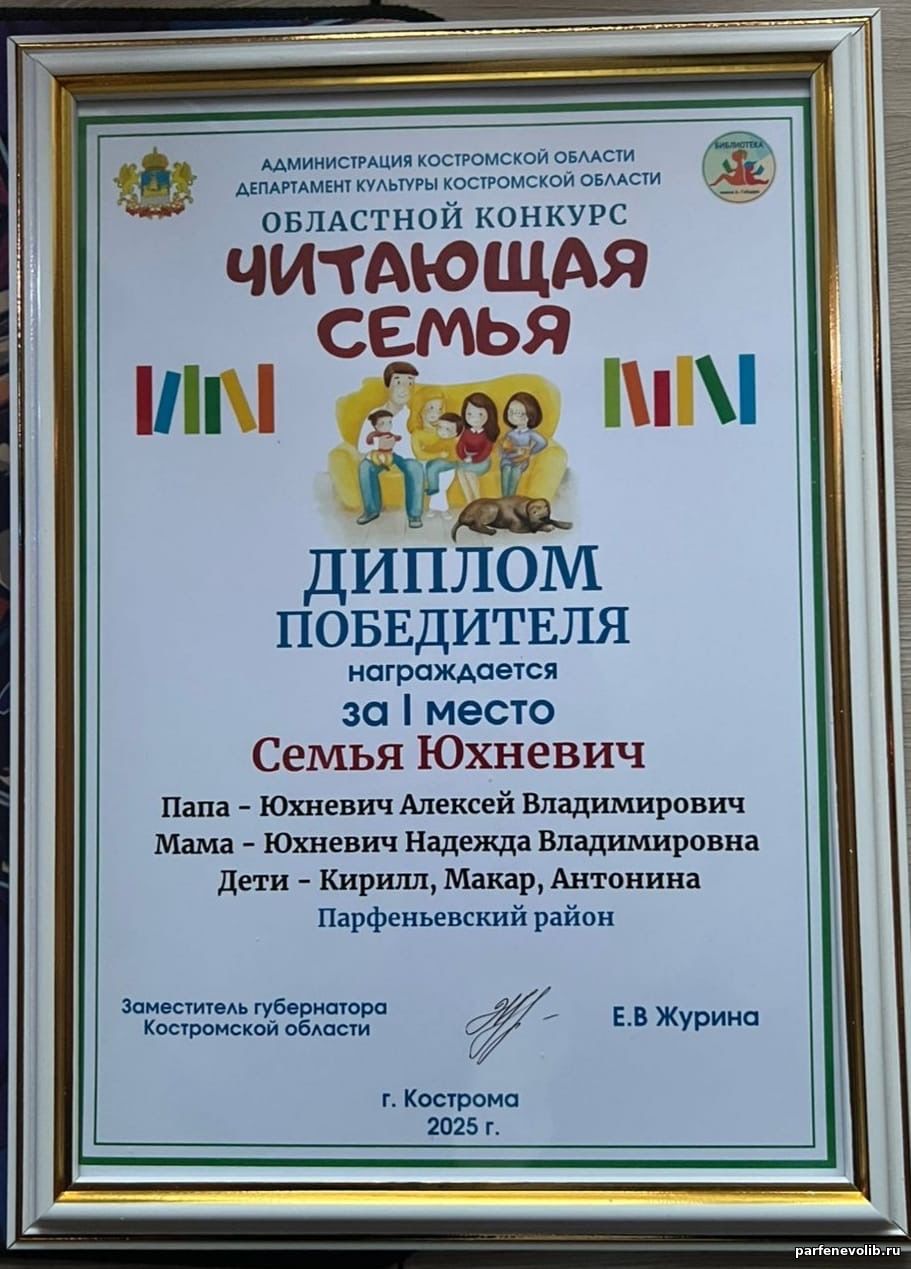 Диплом победителя конкурса «Читающая семья» семье Юхневич вручила заместитель губернатора Костромской области Елена Викторовна Журина и поблагодарила за активность.