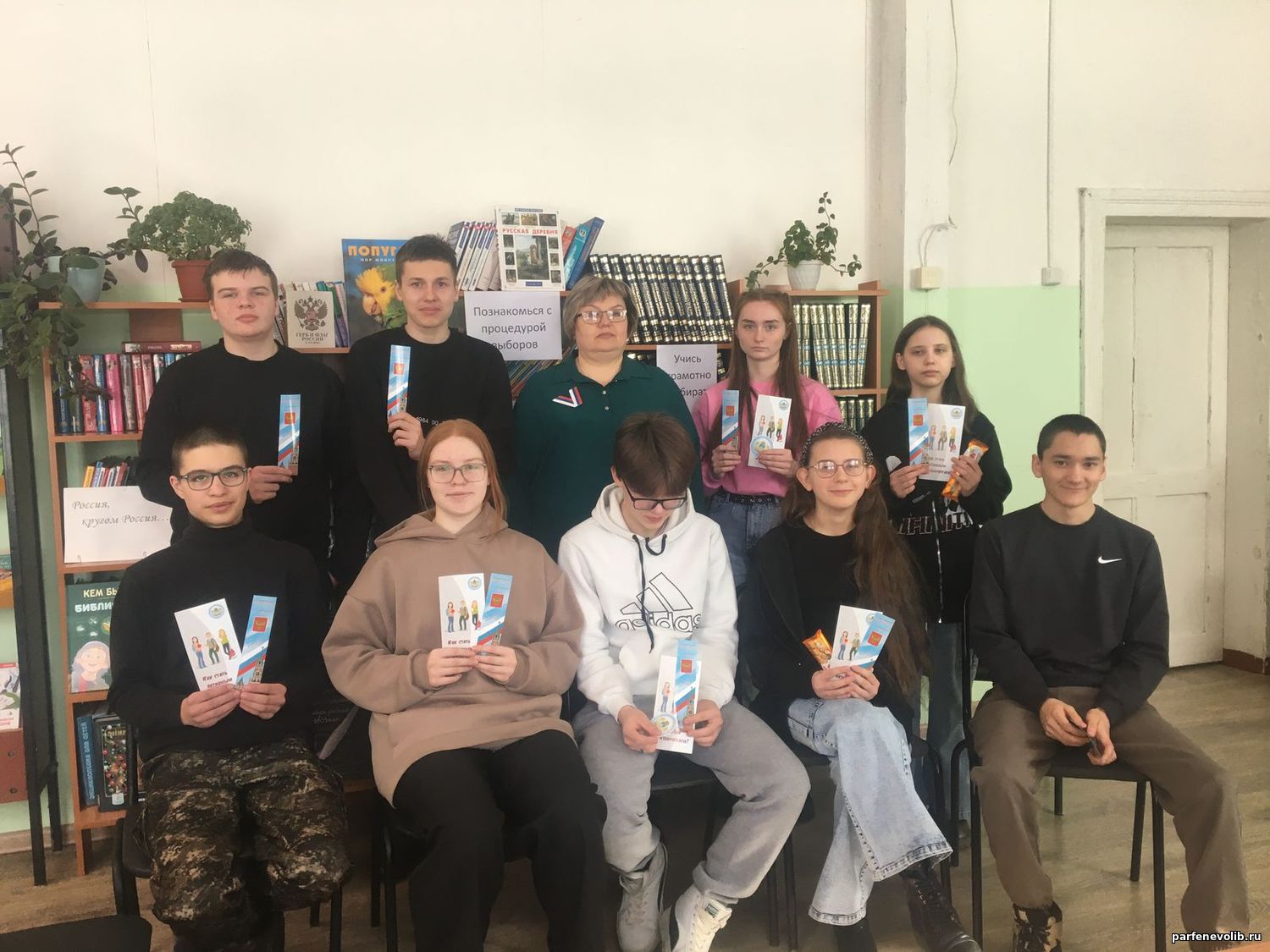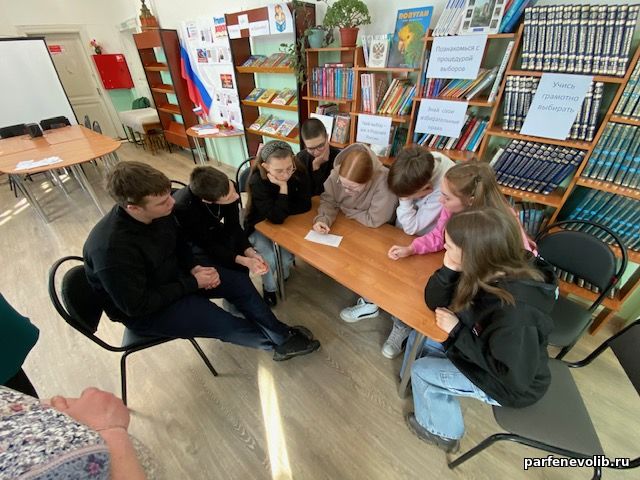 В рамках месячника молодого избирателя 25 марта в Николо-Поломской сельской библиотеке состоялась встреча председателя территориальной избирательной комиссии Парфеньевского муниципального округа Лебедевой Марины Валерьяновны с будущими избирателями, девятиклассниками Николо-Поломской школы. Встреча началась с беседы, на которой Марина Валерьяновна рассказала о важности участия в выборах, об активной гражданской позиции, которую в современном мире должен иметь каждый. Затем прошла деловая игра «Делай выбор грамотно», подготовленная библиотекарями, где ребята познакомились с основами избирательного права, проиграли самые различные ситуации, которые возникают на избирательных участках. На память о встрече председатель комиссии подарила участникам мероприятия буклеты с информацией о выборах, закладки для книг с символикой избиркома и сладкие призы.