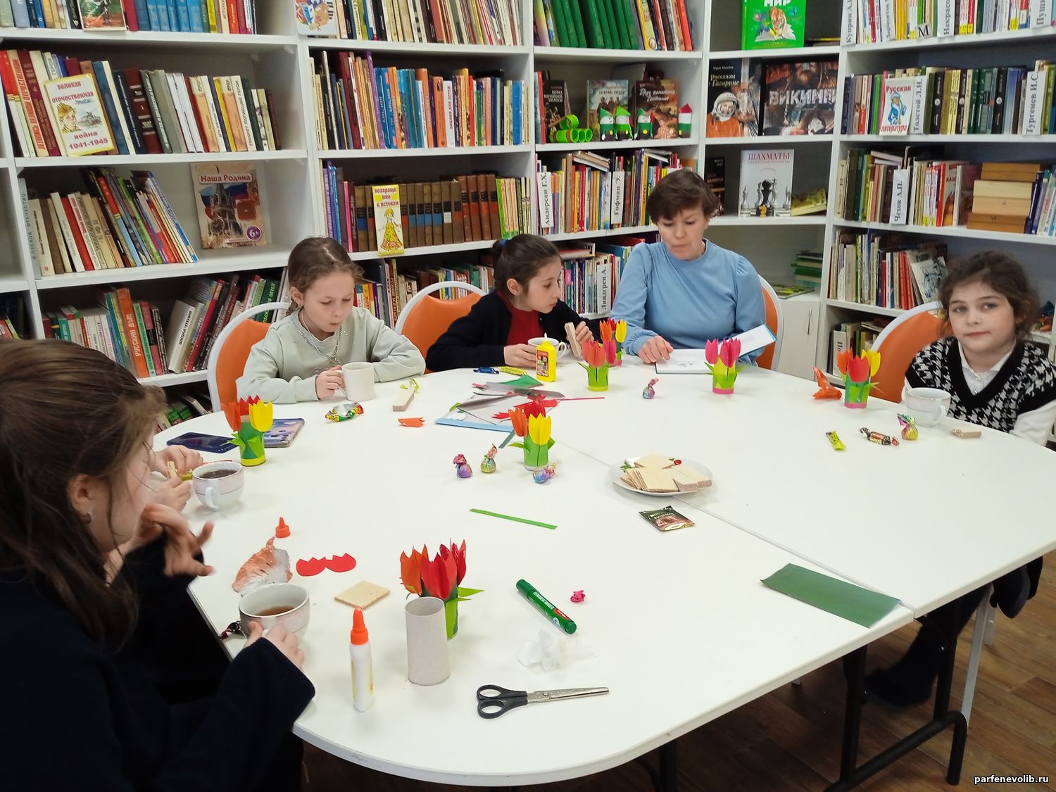 А девочки – участницы творческой мастерской «Подарок для мамы», изготовив для своих мамочек нежные букеты из картона и цветной бумаги, устроили дружеское чаепитие, вкусно хрустели вафельными конфетами и с удовольствием слушали рассказ «Хрухрумчик» из книги И.Носова «Женькин клад и другие школьные рассказы». Рассказ девочкам понравился, прослушав его, они приняли участие в обсуждении и наперебой вспоминали истории из своей школьной жизни.