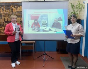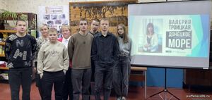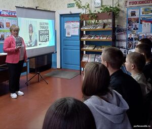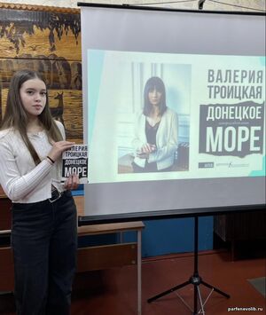 В год Защитника Отечества в рамках проекта межведомственного взаимодействия школьных и публичных библиотек Костромской области «Библиолига», в рамках совместного проекта Вохтомской сельской библиотеки МБУК ЦБС Парфеньевского округа и школьной библиотеки МКУК «Вохтомская ООШ» «Время правды, памяти и мужества» для учащихся 8-9 классов школы был проведен литературно-патриотический час «История семьи, вплетённая в трагедию земли Донбасса» (по книге Валерии Троицкой «Донецкое море. История одной семьи»). Ведущие-библиотекари, соведущие -педагоги школы, учащиеся.