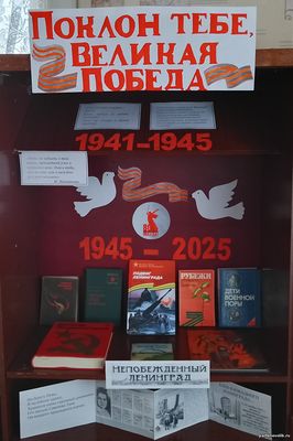 В рамках Года Защитника Отечества и 80- летия Победы в Великой Отечественной войне 1941-1945 гг. Долматовская сельская библиотека для пользователей всех возрастов подготовила книжную выставку «Поклон тебе, Великая Победа. Блокада и её герои». На выставке представлены документальные и исторические очерки, мемуары, воспоминания очевидцев, художественные произведения А. Чаковского «Блокада», С. Алексеева «Подвиг Ленинграда», А Сапарова «Мальчишка из Ленинграда», стихи О. Бергольц и другие, информация об Иване Геннадьевиче Александрове, нашем земляке - защитнике Ленинграда. За боевые заслуги он был награждён Орденом Славы III степени, орденом Отечественной войны I степени, медалями: «За отвагу», «За оборону Ленинграда», «За победу над Германией в Великой Отечественной войне 1941-1945гг».