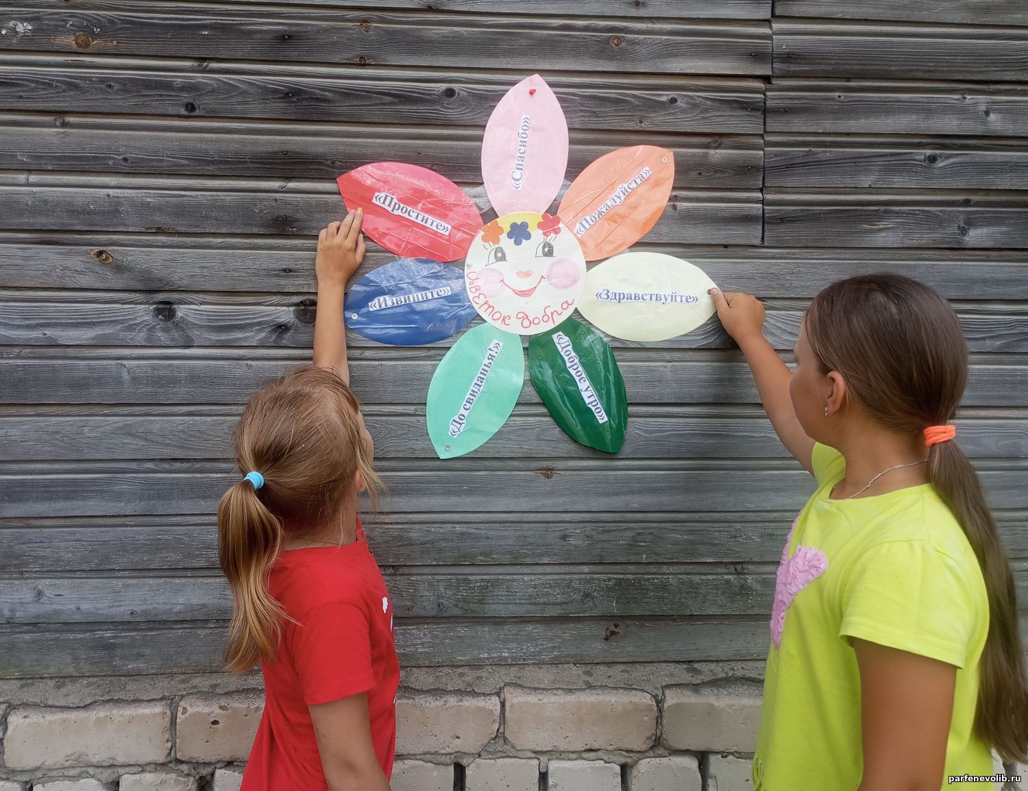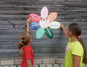 Дети с удовольствием участвовали в играх: «Изобразите, улыбку получите», «Улыбайся», «Игра с залом», «Собери пословицу». Веселые улыбки и звонкий смех сопровождали сценку «Как Кирилл заговорил» и «Шутливые стихотворения». Далее ребята смастерили цветок добра и повесили его на улице, для того чтобы люди не забывали добрые слова и как можно чаще говорили их друг другу. Завершился день подвижными играми на природе.