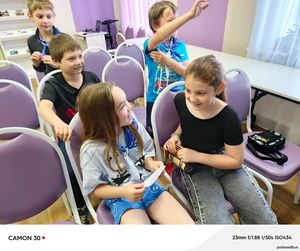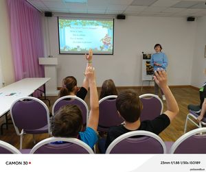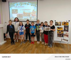 Далее ребята, разделившись на 2 команды, отправились в «Путешествие по книжному царству», отвечая на вопросы подготовленной слайд-презентации. Они угадывали сказки по отрывкам, по портретам узнавали писателей и поэтов, разгадали вопросы короля Сладестина и побывали в гостях в импровизированной картинной галерее, где по описанию определили картины известных художников.