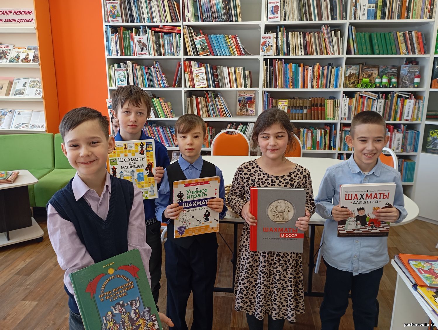 Для детей – участников семейного клуба выходного дня «Юный шахматист» состоялся тематический обзор у книжной выставки «Школа шахматной игры».