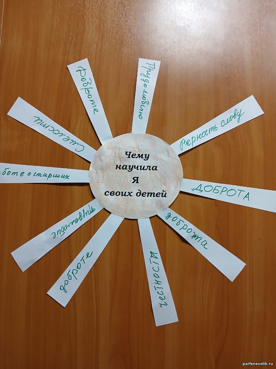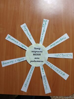 В конце встречи женщины создали два солнышка. На лучах одного из них они написали качество, которое они получили от родителей, а на лучах другого — качество, переданное своим детям.
