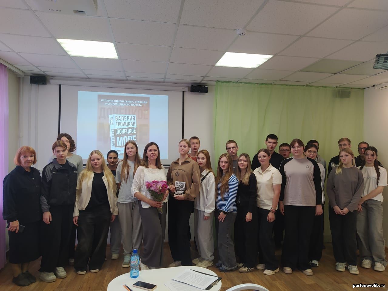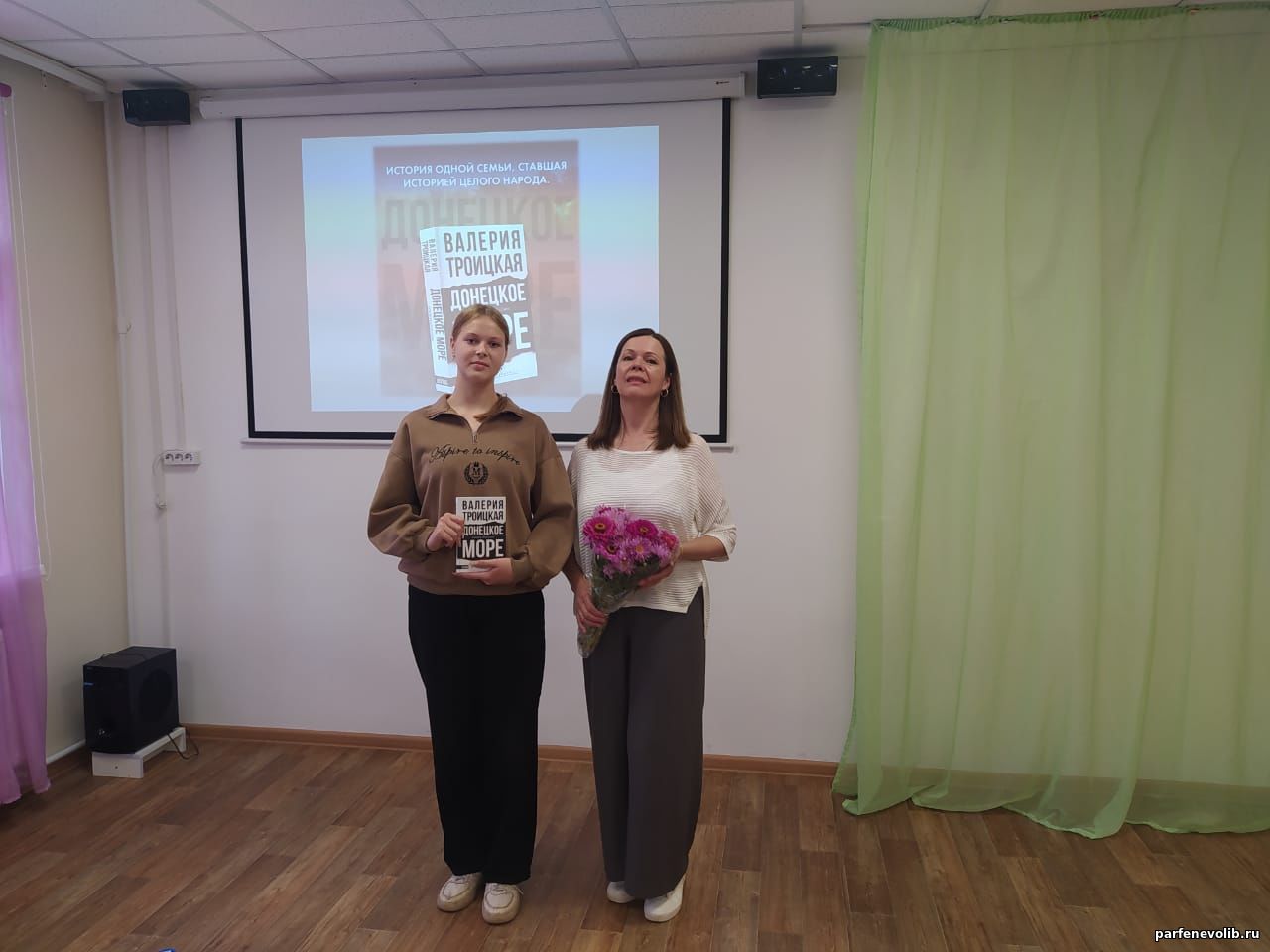 12 сентября в Парфеньевской центральной библиотеке состоялась творческая встреча с замечательной актрисой, режиссёром и художественным руководителем театра «Ковчег» из Санкт-Петербурга Манониной -Петрович Людмилой Николаевной. Людмила Николаевна работает над спектаклем по книге Валерии Троицкой «Донецкое море», который состоится весной будущего года в Санкт-Петербурге.