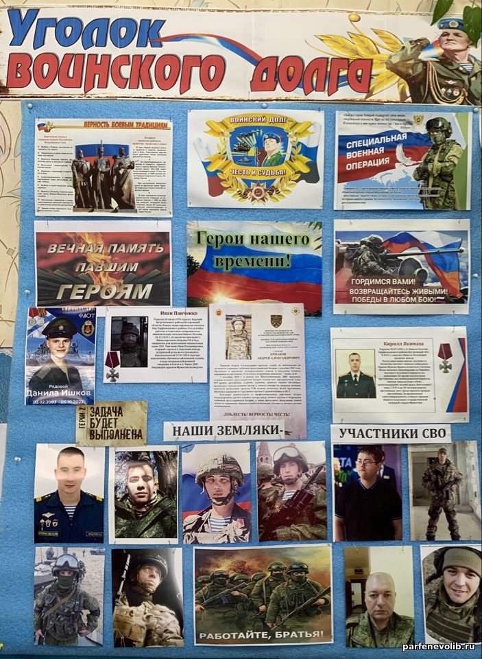 В Вохтомской сельской библиотеке обновлена информационно-патриотическая выставка «Уголок воинского долга», направленная на формирование и развитие личности, обладающей качествами патриота своей страны. Выставка посвящена Героям нашего времени, участникам специальной военной операции - землякам родного поселка и Парфеньевского округа. Фотоэкспозиция выставки и материалы о воинском подвиге наших земляков никого не оставляют равнодушным. Ни одно патриотическое мероприятие в библиотеке не обходится без обращения к выставке. Это подчеркивает ее значимость в современном мире.