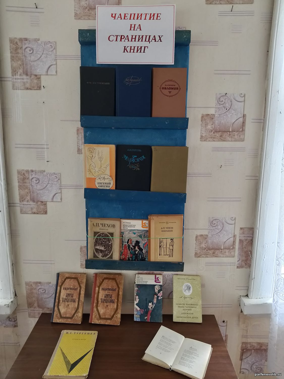В библиотеке оформлена книжная выставка «Чаепитие на страницах книг». Здесь собраны произведения, в которых описаны сцены чаепития: «Евгений Онегин» и «Капитанская дочка» А. Пушкина, «Обломов» И. Гончарова, рассказы А. Чехова «В овраге» и «Дядя Ваня», «Мёртвые души» Н. Гоголя, а также «Герой нашего времени» М. Лермонтова.