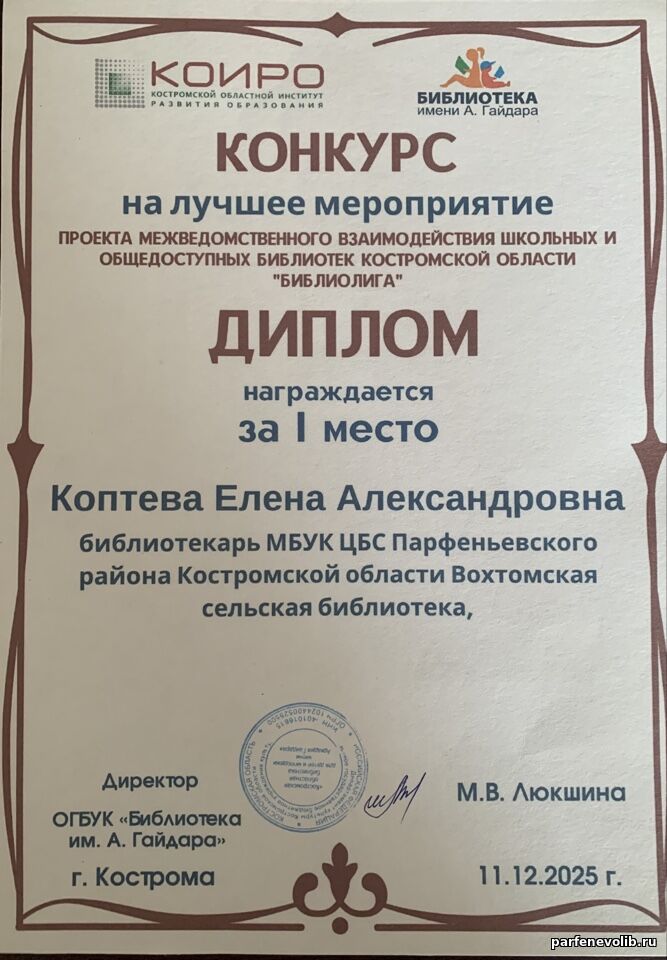 Библиотекарь Вохтомской сельской библиотеки Коптева Е.А. одержала победу в областном конкурсе на лучшее мероприятие проекта межведомственного взаимодействия школьных и общедоступных библиотек Костромской области «БиблиоЛига», который был организован областным государственным бюджетным учреждением культуры «Костромская областная библиотека для детей и молодежи имени Аркадия Гайдара» и областным государственным бюджетным образовательным учреждением дополнительного профессионального образования «Костромской областной институт развития образования».