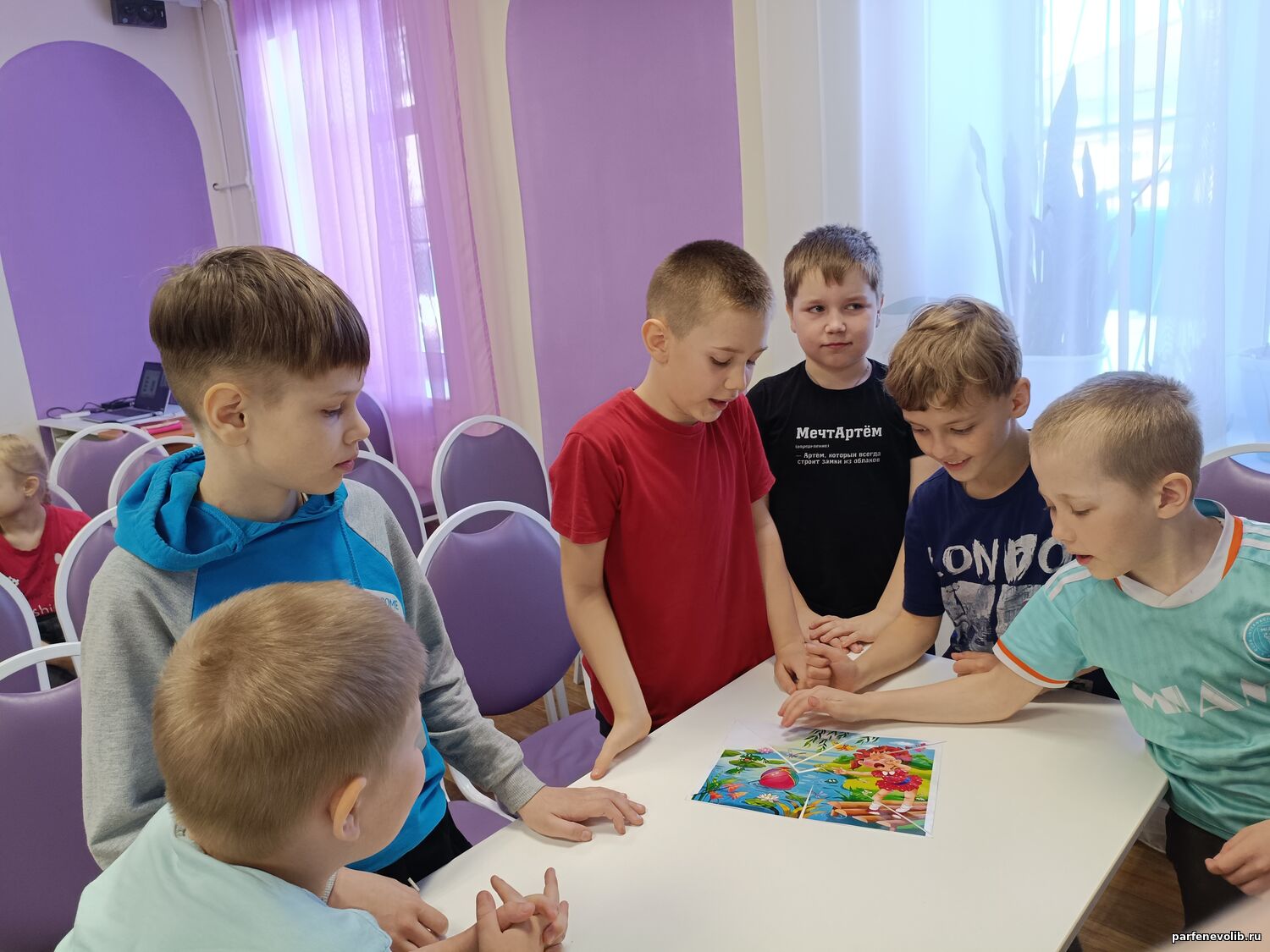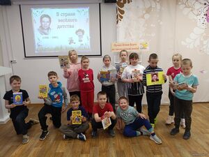 Разделившись на 2 команды, ребята активно отвечали на вопросы видеовикторины «Игрушки», дружно собирали пазлы‑иллюстрации к стихотворениям, вместе с библиотекарем вслух декламировали любимые произведения и участвовали в шуточном конкурсе «Найди ошибку».